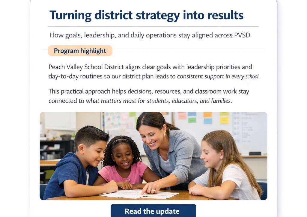 Peach Valley School District strategically aligns goals and operations across all schools to drive clarity, credibility, and academic results, fostering a culture of continuous improvement.
