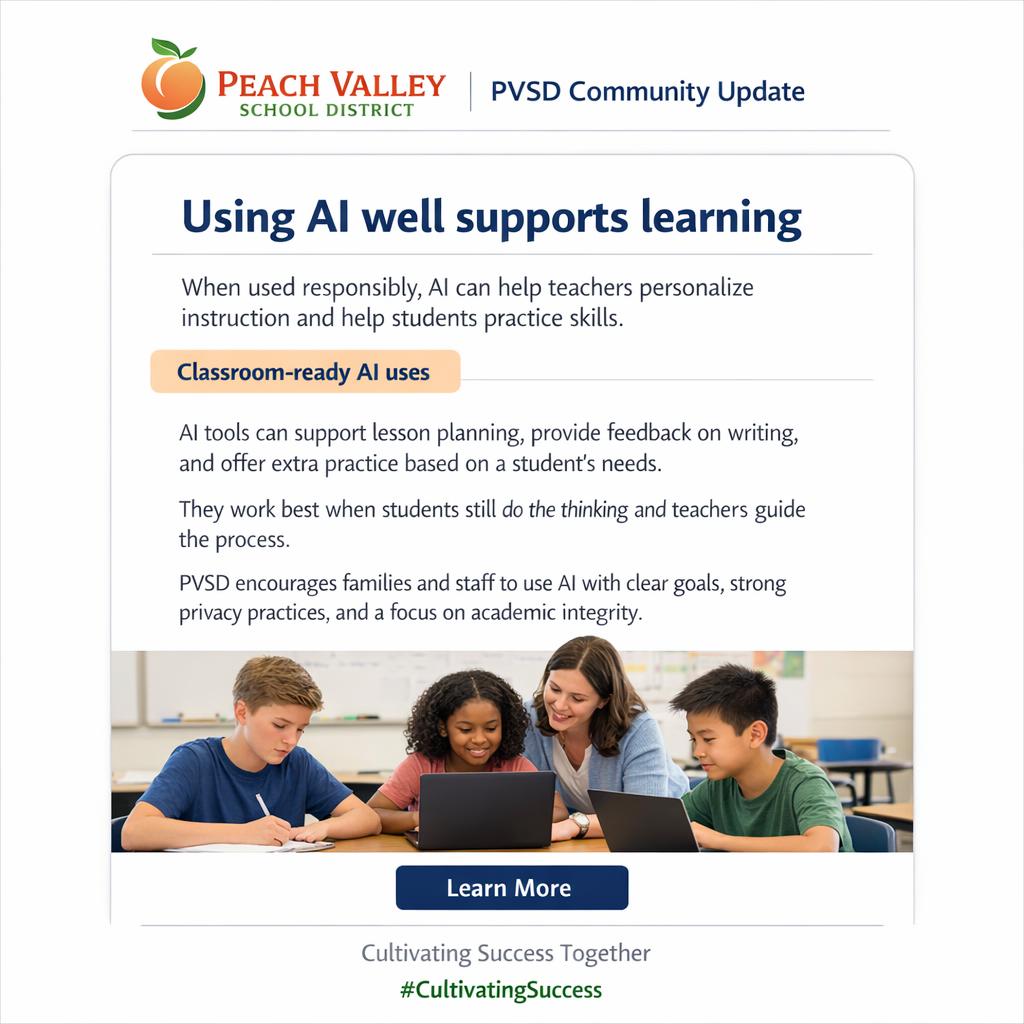 Peach Valley School District has long focused on providing clarity, credibility, and results in every classroom. Our mission is to empower each student—academically, socially, and emotionally—while fostering a sense of trust, belonging, and future-ready pathways. In recent years, a promising trend in education has emerged: artificial intelligence. When used responsibly, AI technology can help teachers multiply their efforts, spark student curiosity, and extend our tradition of community-focused stewardship.